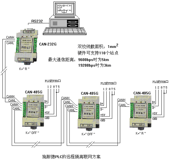 二、采用CAN-485G遠程驅動器達到5公里通信距離: