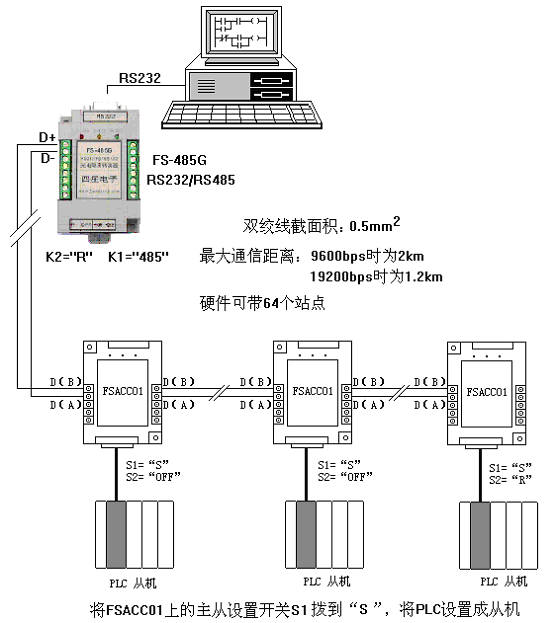 通信線選截面積為0.5mm2以上的雙絞線,將RS232/RS485隔離轉換器FS-485G上的設置開關K1撥到“485”選擇RS485模式,K2撥到“R”接入120歐終端電阻;將總線末端FSACC01上的終端電阻設置開關S2撥到“R”,接入120歐終端電阻,其它站點的終端電阻設置開關S2撥到“OFF”。
