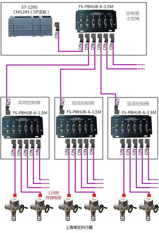 1、采用PROFIBUS集線(xiàn)器走星型連接拓?fù)?,將分散各處的從站?zhí)行器的PROFIBUS信號(hào)通過(guò)集線(xiàn)器匯聚到S7-1200主站,網(wǎng)絡(luò)拓?fù)淝逦?,便于故障排除和設(shè)備維修。如圖1所示。