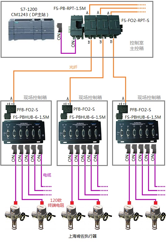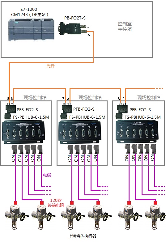 2、采用PROFIBUS集線(xiàn)器加光纖HUB的方案: