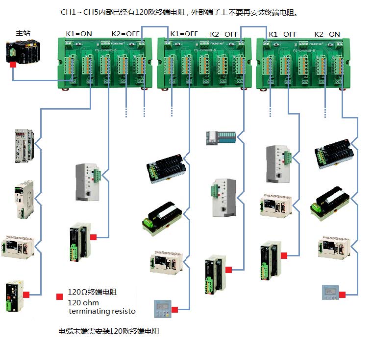這種方案可以多出一個CAN口。擴展總線CANH0、CANL0通常就近接主站設備,這個主站設備的CAN口需接一只120歐終端電阻,最后一臺FS-CANHUB-5右邊的開關(guān)撥到ON,除此之外的所有開關(guān)撥到OFF。如下圖所示,注意圖中開關(guān)的設置。