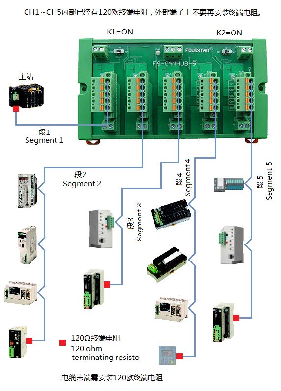 單個使用FS-CANHUB-5可實現(xiàn)5口CAN集線器。這時需將擴展總線上的開關(guān)K1、K2均撥到ON位置,由于CAN口CH1~CH5內(nèi)部已經(jīng)有120歐終端電阻,所以只需在每路對應的電纜末端安裝一只120歐終端電阻即可。
