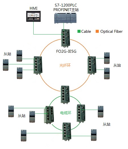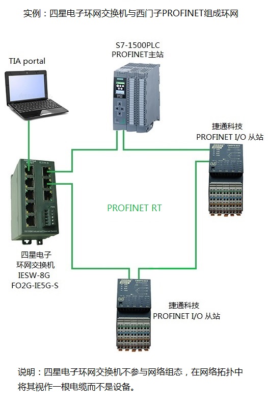 德陽(yáng)四星電子技術(shù)有限公司的8口千兆環(huán)網(wǎng)交換機(jī)IESW-8G和2光5電千兆環(huán)網(wǎng)交換機(jī)FO2G-IE5G-S,支持PROFINET等工業(yè)以太網(wǎng),并支持單環(huán)、雙環(huán)和多環(huán)等環(huán)網(wǎng)拓?fù)?,在網(wǎng)絡(luò)拓?fù)浣M態(tài)時(shí),只需將其視為一根電纜,而不是作為設(shè)備參與組態(tài)。下面是用于西門子S7-1200PLC和S7-1500PLC的PROFINET RT的應(yīng)用實(shí)例: