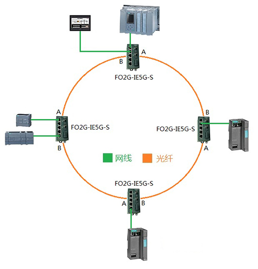 使用FO2G-IE5G-S(型號中帶G的支持環(huán)網(wǎng))光纖適配器升級為光纖環(huán)網(wǎng)如圖2-3所示,由于FO2G-IE5G-S光纖適配器本身具有環(huán)網(wǎng)功能,所以在PROFINET網(wǎng)絡(luò)組態(tài)中不能組態(tài)成環(huán)網(wǎng)。特別適合不具備環(huán)網(wǎng)功能的設(shè)備或只有一個(gè)網(wǎng)口的設(shè)備組成光纖環(huán)網(wǎng),也可組成網(wǎng)線環(huán)網(wǎng)或光纖網(wǎng)線混合環(huán)網(wǎng)。