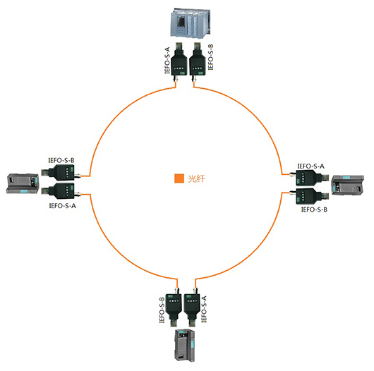 使用IEFO-S-A和IEFO-S-B光纖適配器升級為光纖環(huán)網(wǎng)如圖2-2所示,特點(diǎn)是PROFINET網(wǎng)絡(luò)組態(tài)同電纜環(huán)網(wǎng)相同,即組態(tài)成環(huán)網(wǎng),其功能與網(wǎng)線連接時(shí)完全相同。