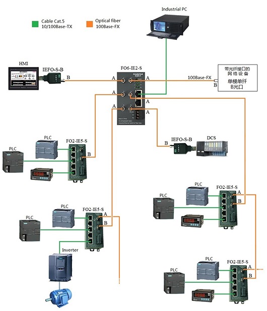圖1-3是使用FO2-IE5-S光纖適配器,這是標(biāo)準(zhǔn)導(dǎo)軌安裝形式,特別適合只有一個(gè)網(wǎng)口的設(shè)備組成光纖總線型拓?fù)?,同時(shí)FO2-IE5-S的5個(gè)網(wǎng)口還可以接更多的設(shè)備。