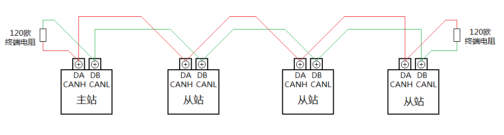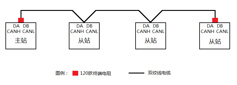 眾所周知,RS485和CAN是一種采用雙絞線(特性阻抗為120歐姆)傳輸的、手牽手、無支線、總線兩端必須有終端電阻的一種線性總線結構,如圖1-1所示。