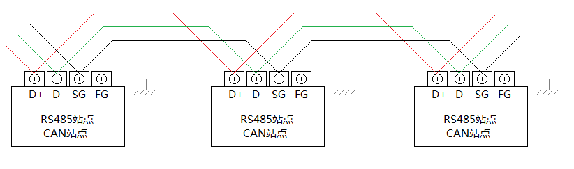 很多RS485和CAN總線產品還有一個信號地(通常符號為SG、DG)端子,按照相關標準上的表述是需要用一根導線將所有站點的信號地連通,使之成等電位,以免各站點地電位差太大損壞RS485或CAN器件。如圖5-1所示。