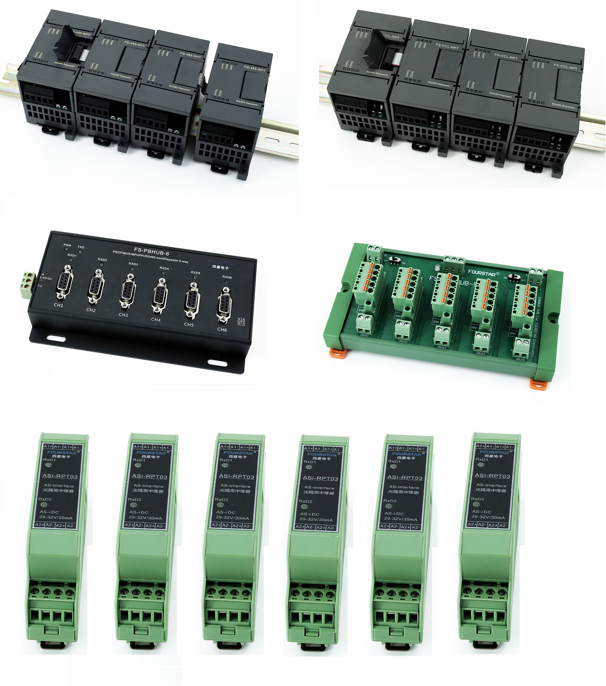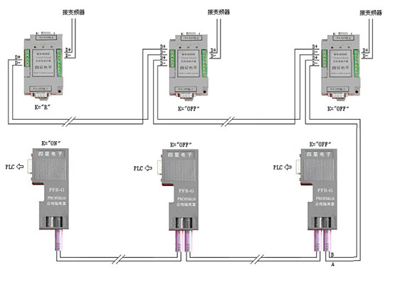 四星電子為RS485和CAN總線的星型連接拓撲研發(fā)出了系列集線器,如組合式RS485集線器、組合式CC-Link集線器、組合式LonWorks集線器、PROFIBUS集線器、CAN總線集線器、AS-i總線集線器等系列產品。如圖7-2所示。