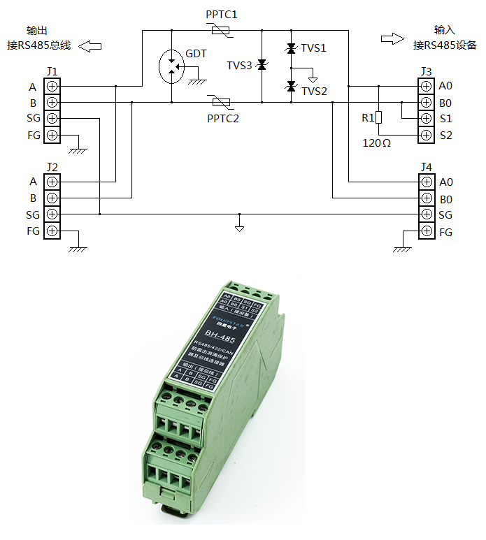 該保護器內還帶有120歐終端電阻,通過短路S1、S2端子來接入終端電阻,而且該產品設計成J1、J2雙接線端子,這樣便于實現手牽手的無支線的連接方式。