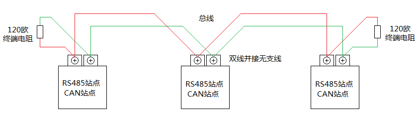 對于那些只有一對接線端子的RS485和CAN接口,可采用雙線并接一個端子的方式來實現無支線結構,如圖3-5所示。