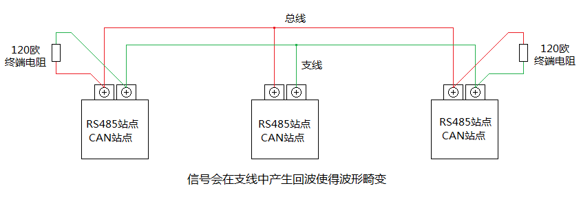 當RS485或CAN信號在總線上傳輸時,會在支線中產生回波使得信號波形畸變,當支線長度過長或者支線站點過多時尤其嚴重。常見的錯誤支線如圖3-2所示。