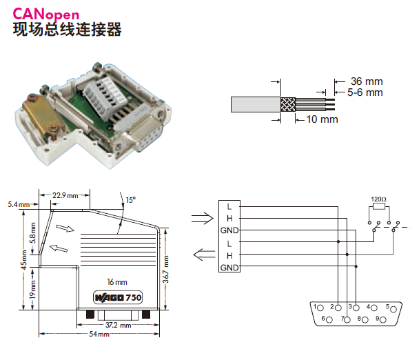 對于接口形式是DB9插座的現場總線,如PROFIBUS、PPI、MPI、CANOpen,西門子等公司早已設計有PROFIBUS總線連接器(俗稱DP插頭)、CANOpen總線連接器等部件,只要使用這些連接器就可實現無支線的網絡結構,PROFIBUS總線連接器的原理圖見前面的圖2-7,下面圖3-3是CANOpen總線連接器原理圖。