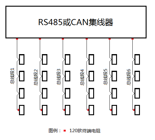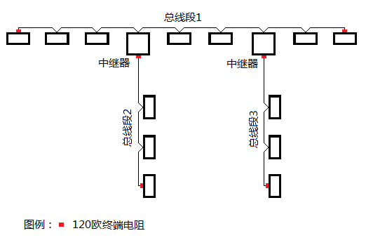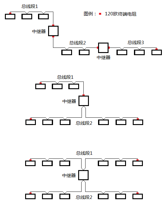 圖3-6 RS485和CAN總線在分支處須安裝中繼器