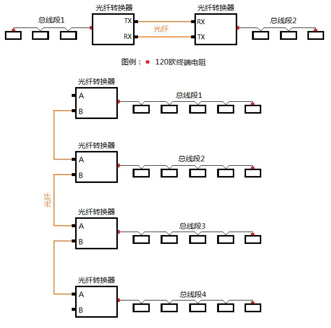 由于信號是雙向傳輸的,所以一段總線電纜的終端電阻是2個,需分別安裝在一段電纜的兩端。當總線中安裝有中繼器、集線器、光纖轉換器等部件后,電纜就被這些部件分割成了幾段,每段電纜的兩端都須安裝終端電阻,以此類推,如圖2-1、圖2-2、圖2-3所示。