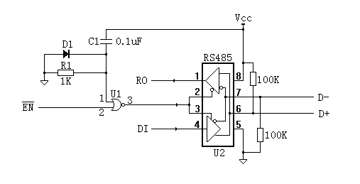 當上電瞬間,C1電壓不能突變,或非門U1的1腳為高電平,輸出3腳為低電平,確保了RS485芯片U2的發(fā)送器關閉,不會對總線造成擾動;當經過t=R1×C1時間后,U1的1腳變?yōu)榈碗娖?,使能信號EN才開始控制RS485芯片U2的數據收發(fā)。二極管D1的作用是反向電壓鉗位保護。