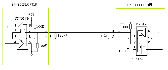 如圖2-5是S7-200PLC的RS485通信口簡化圖,為了保證總線上能夠掛接數十個RS485站點,PLC的RS485接口上只能設計兩個100K的弱上拉電阻和下拉電阻(也稱為偏置電阻,該電阻不能過小,否則節(jié)點掛多了時會把總線拉死?。?。