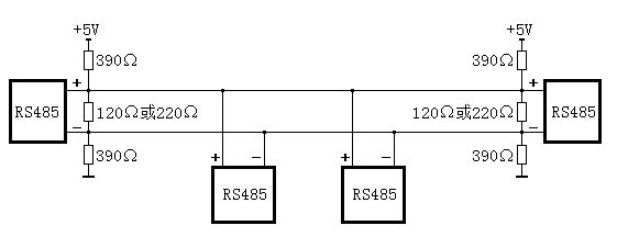 接入120歐終端電阻后,在RS485總線上產生偏置電壓為:5×0.12 /(100+100+0.12)=0.003V,眾所周知,RS485芯片的門限電壓為±0.2V,也就是說RS485輸入電壓在-0.2V~+0.2V之間時,其接收器的輸出是不確定的,如果接收器輸出為邏輯0 ,就會使CPU收到連續(xù)長0信號而無法正常通信。