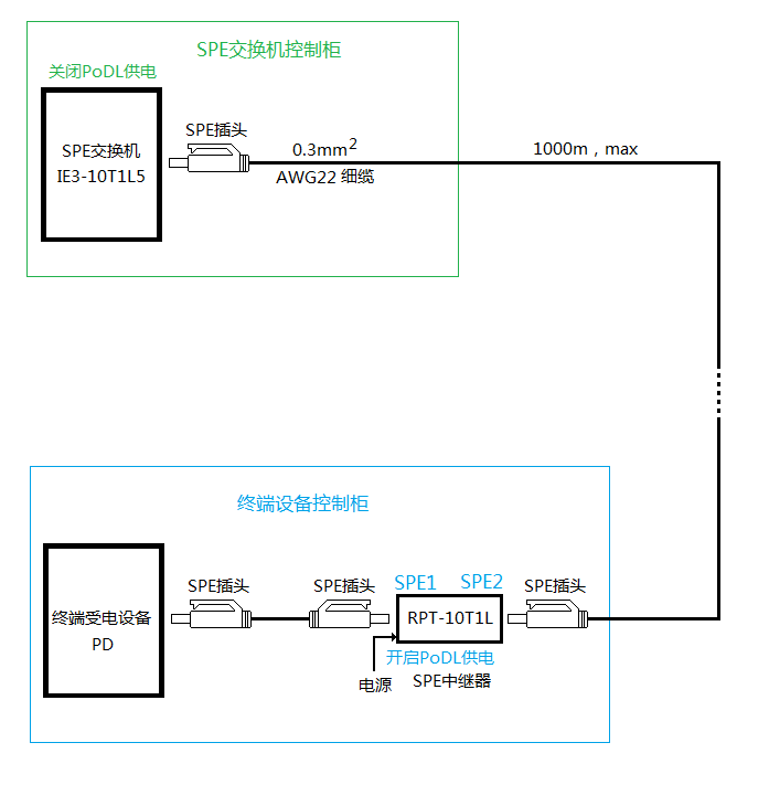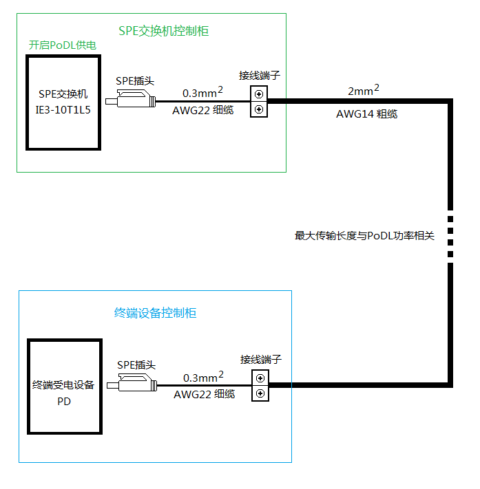 1、SPE交換機的連接器插頭到控制柜出線端子用細纜,SPE交換機控制柜的出線到現(xiàn)場終端設(shè)備控制柜的進線之間用粗纜,不同功率等級下的最大電纜長度參看上面的IEEE802.3cg標準表格里的數(shù)據(jù),現(xiàn)場控制柜到終端受電設(shè)備之間用細纜。如下圖所示:
