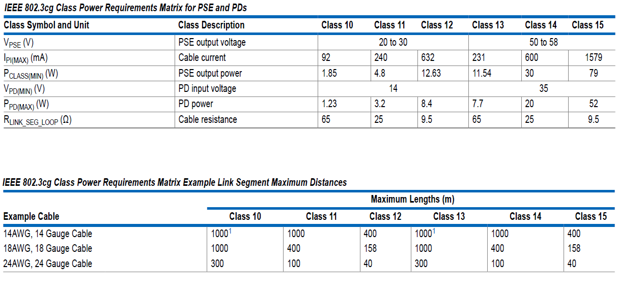 開啟PoDL供電時,由于SPE電纜中流過功率電流,會在電纜上產(chǎn)生一定的壓降,功率越大壓降越大,電纜電阻越大壓降越大,所以在不同受電設(shè)備PD的功率等級下,電纜的截面積決定了最大傳輸距離,參考下表IEEE802.3cg標準。