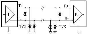 圖5給出了本采用TVS的保護電路。在發(fā)送端和接受端各采用3個TVS單元,分別對線路之間、線路對地之間的瞬態(tài)電壓干擾進行抑制,消除了由于強電進入而產生通訊口被燒毀的現(xiàn)象,從而有效的保證了整個通訊系統(tǒng)的安全運行。
