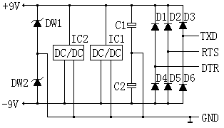 本裝置不需外接電源,其工作電源從RS232接口上竊取。如圖4所示:圖中TXD、RTS、DTR是RS232的輸出信號,每根信號線可提供約9mA的輸出電源,通訊時其電壓在+10V和-10V之間跳變,通訊停止后其電壓極性不定,但開機上電時全部為-10V。該三個信號經D1~D6全波整流和C1、C2濾波后得到+9V和-9V直流電壓,若是開機上電狀態(tài)則只有-9V電壓。IC1和IC2分別是負電壓到正電壓轉換器和正電壓到負電壓轉換器,將輸入電壓轉換極性并升壓,這樣無論TXD、RTS、DTR是什么極性都能在DW1和DW2端得到+9V和-9V的穩(wěn)定電壓。亦即不需靠軟件設置來得到工作電壓,確保適合所有軟件!其實只需以上任意一根信號線即可滿足要求。