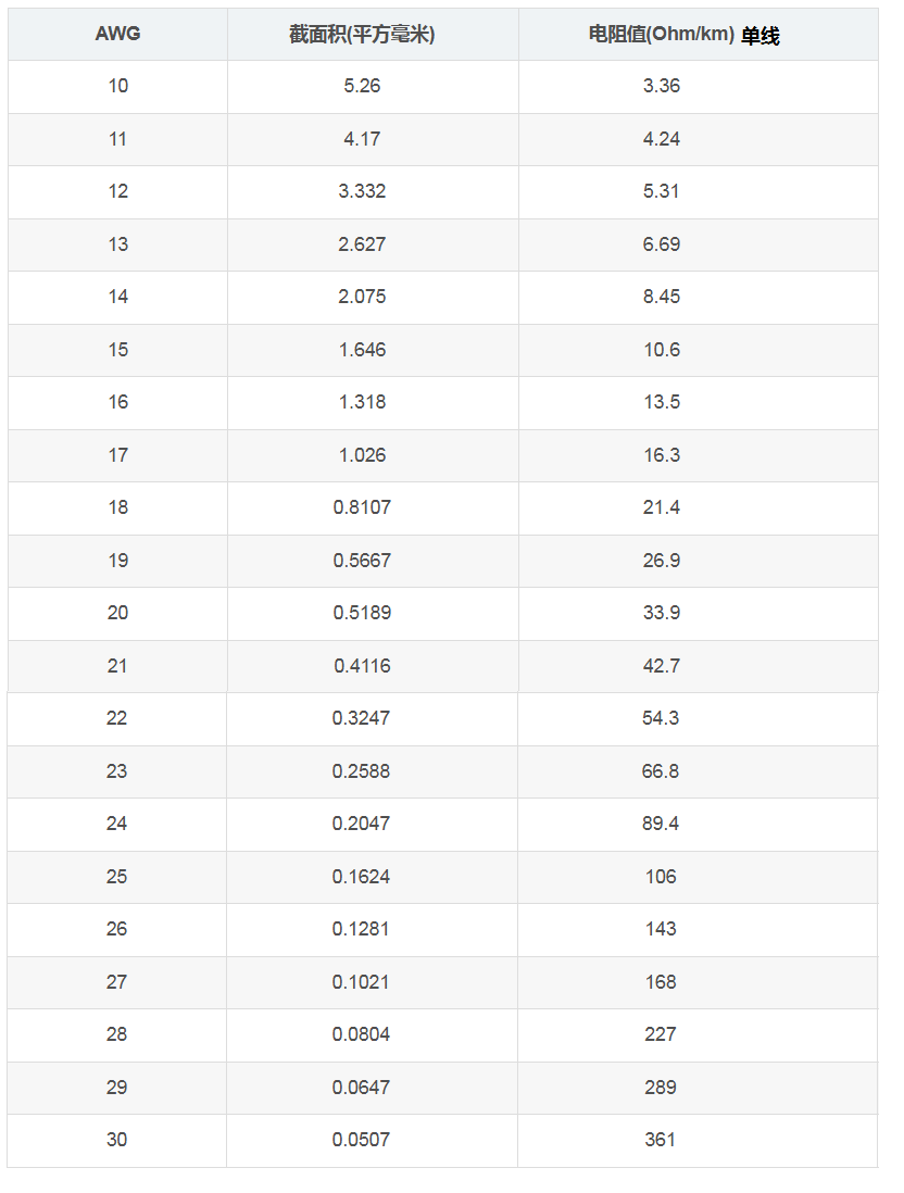 下面是美規(guī)線的截面積與電阻值(單根線)對照表: