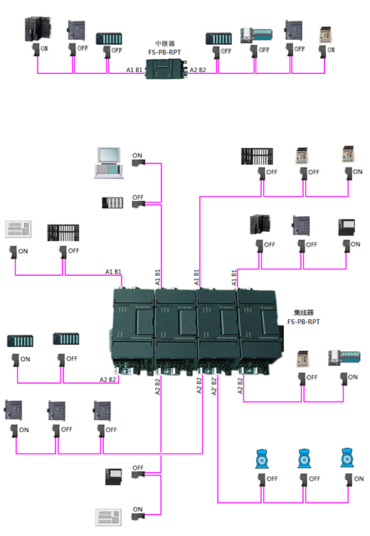 可擴展數(shù)量 | 單個使用作為中繼器,N個可組合成2N口集線器。最多可以擴展10臺FS-PB-RPT組合成20口集線器。 |